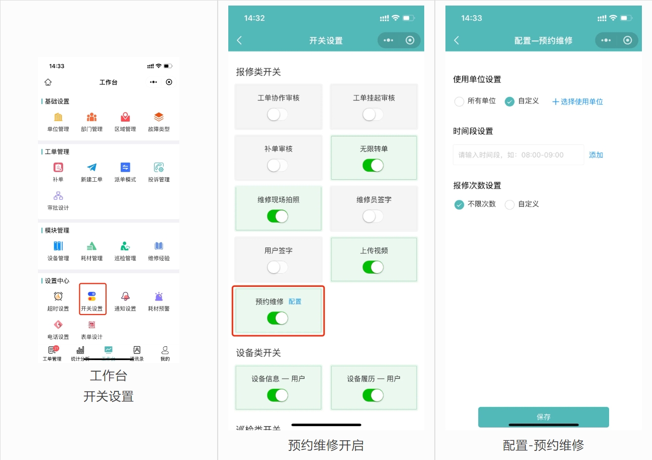 移动端:管理员需登录身份→进入工作台→在开关设置中开启“维修预约”功能,随后即可展示时段配置选项。
